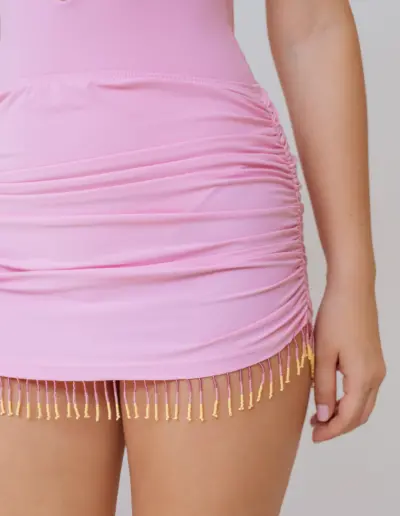 Preciosa y delicada falda de color rosa, cuenta con tonalidades de mostacillas en diversos colores claros, lo que le permite su versatilidad para usar con cualquier prenda.